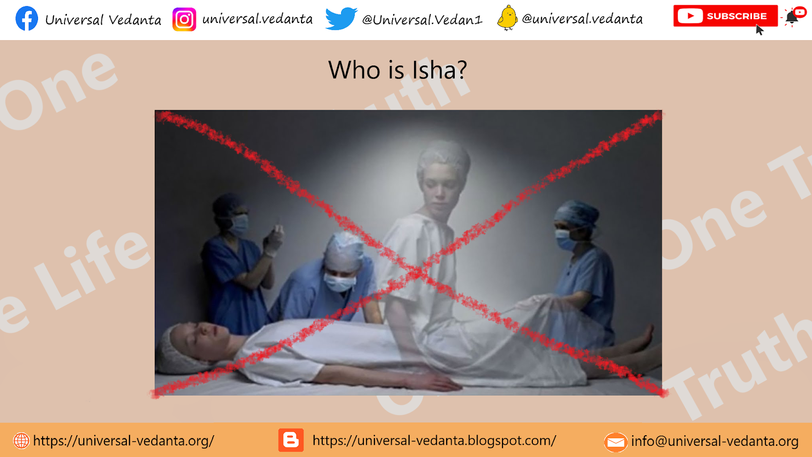 A. Isha means by the Lord. That means Brahman or God is supreme ruler. Do not be confused, it does not say that there is a ruler ruling the world from up above the sky or heaven. On the contrary God's home is you. God is everywhere and in every being. Oh God! Someone residing inside me, you mean my body! Is there any organ like my brain or heart which is conscious, or God is living in that organ? Relax and watch the last video again to understand the Brahman. Here, Brahman or God is living, meaning all the living beings are part of that ocean of consciousness. As we are just the waves of that ocean, the ocean and we are made of the same water. Either way you can think of. Brahman is living inside you, or you are living in the Brahman. Thus, it essentially means that no one will come out from you when you die one day.